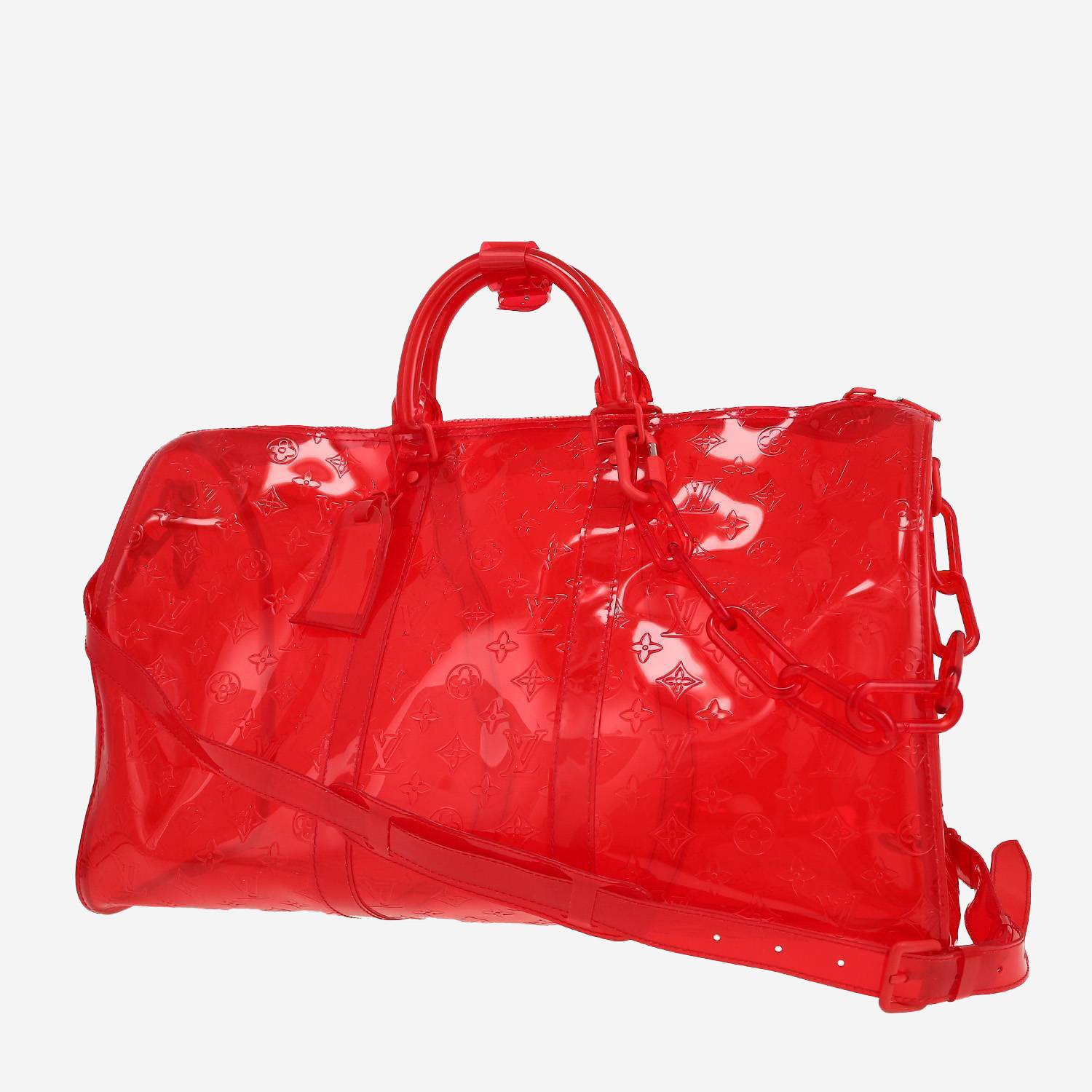 Magnifique sac de voyage Louis Vuitton Keepall Editions Limitées en vinyle rouge, double poignée en vinyle rouge, anse bandoulière amovible en vinyle rouge permettant un porté main ou épaule ou bandoulière.