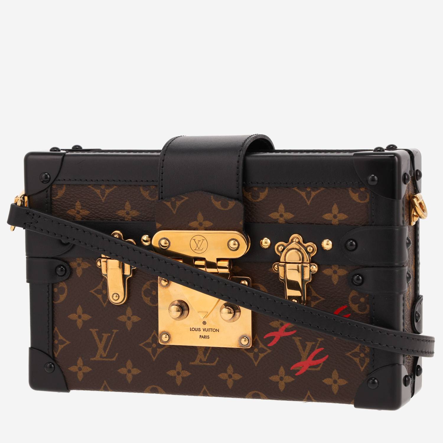 Magnifique sac bandoulière Louis Vuitton Petite Malle en toile monogram marron et cuir noir, garniture en métal doré, une anse bandoulière amovible réglable en cuir noir permettant un porté main ou épaule ou bandoulière.