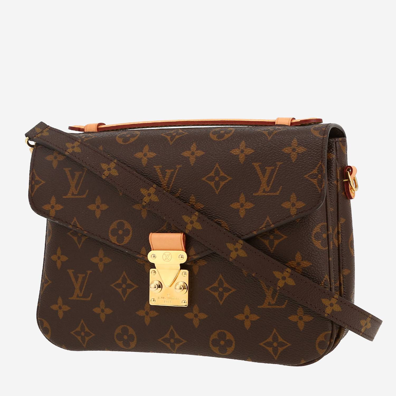 Charmant sac bandoulière Louis Vuitton Metis en toile monogram marron et cuir naturel, garniture en métal doré, poignée simple en cuir naturel, anse bandoulière amovible réglable en toile monogram marron permettant un porté main ou épaule ou bandoulière.
