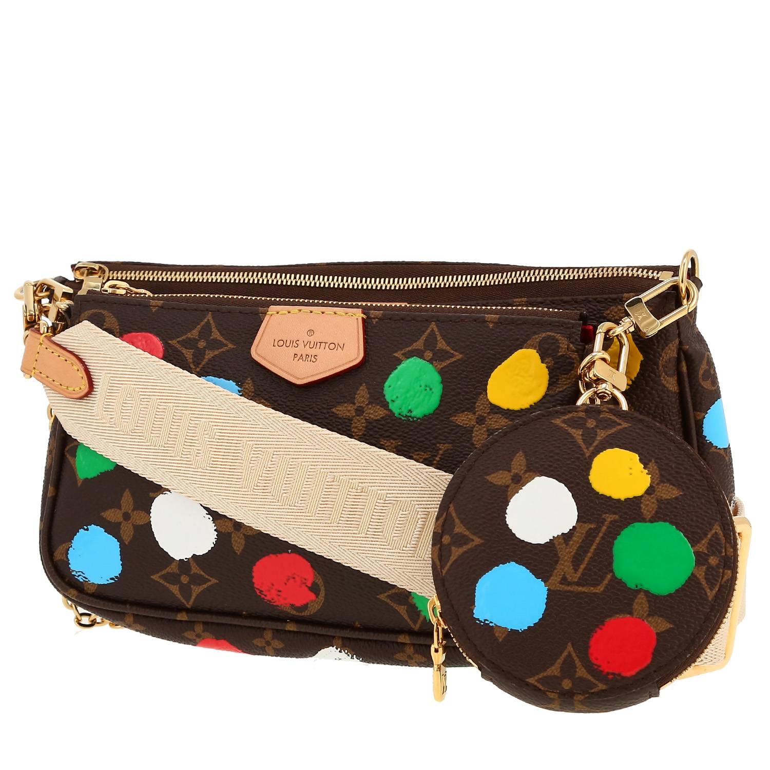 Étonnant sac/pochette Louis Vuitton Multi-Pochette Accessoires en toile monogram marron motifs à pois, garniture en métal doré, une anse-chaine amovible en métal doré, anse bandoulière ajustable en toile beige permettant un porté main ou épaule ou bandoulière.