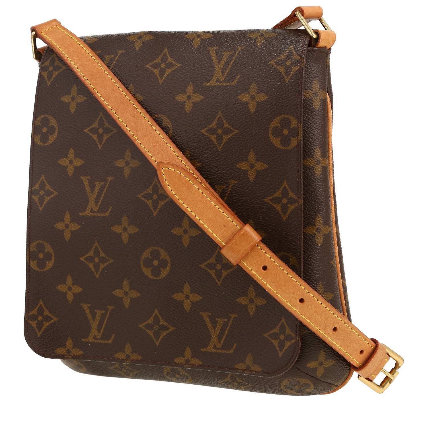 Magnifique sac bandoulière Louis Vuitton Musette en toile monogram marron et cuir naturel, garniture en métal doré, anse bandoulière ajustable en cuir naturel permettant un porté épaule ou bandoulière.