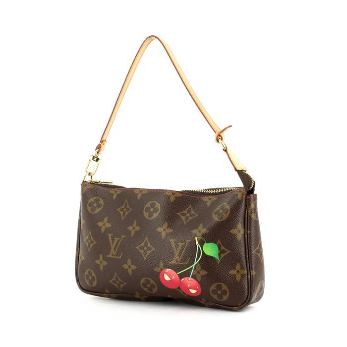 Jolie pochette "Pochette accessoires" en toile monogram décorée de cerises dessinées par l'artiste Takashi Murakami et cuir naturel, garniture en métal doré, anse en cuir naturel permettant un porté main ou poignet.