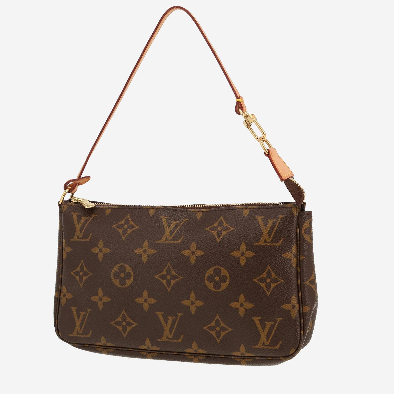 Magnifique sac à main Louis Vuitton Pochette accessoires en toile monogram marron et cuir naturel, garniture en métal doré, une anse amovible en cuir naturel permettant un porté main ou épaule.