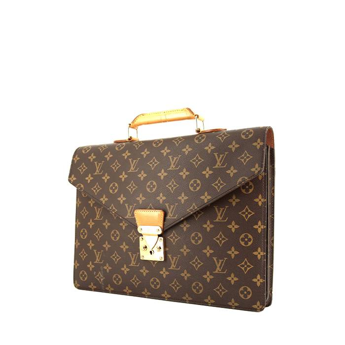 Élégant porte-documents Louis Vuitton en toile monogram marron et cuir naturel, garniture en métal doré, poignée en cuir naturel permettant un porté main.