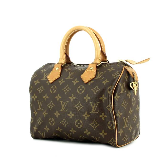 Joli sac à main "Speedy 25 cm" en toile monogram enduite et cuir naturel, fermeture éclair, double poignée en cuir naturel.