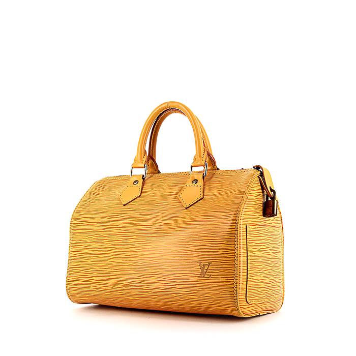 Original sac à main Louis Vuitton Speedy 25 cm en cuir épi jaune, garniture en métal doré, double poignée en cuir jaune permettant un porté main.