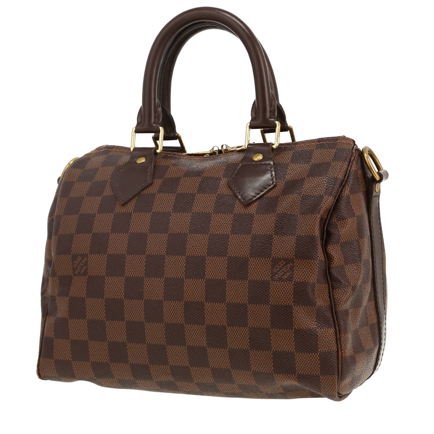 Magnifique sac à main Louis Vuitton Speedy 25 en toile damier ébène et cuir marron, garniture en métal doré, double poignée en cuir marron permettant un porté main.