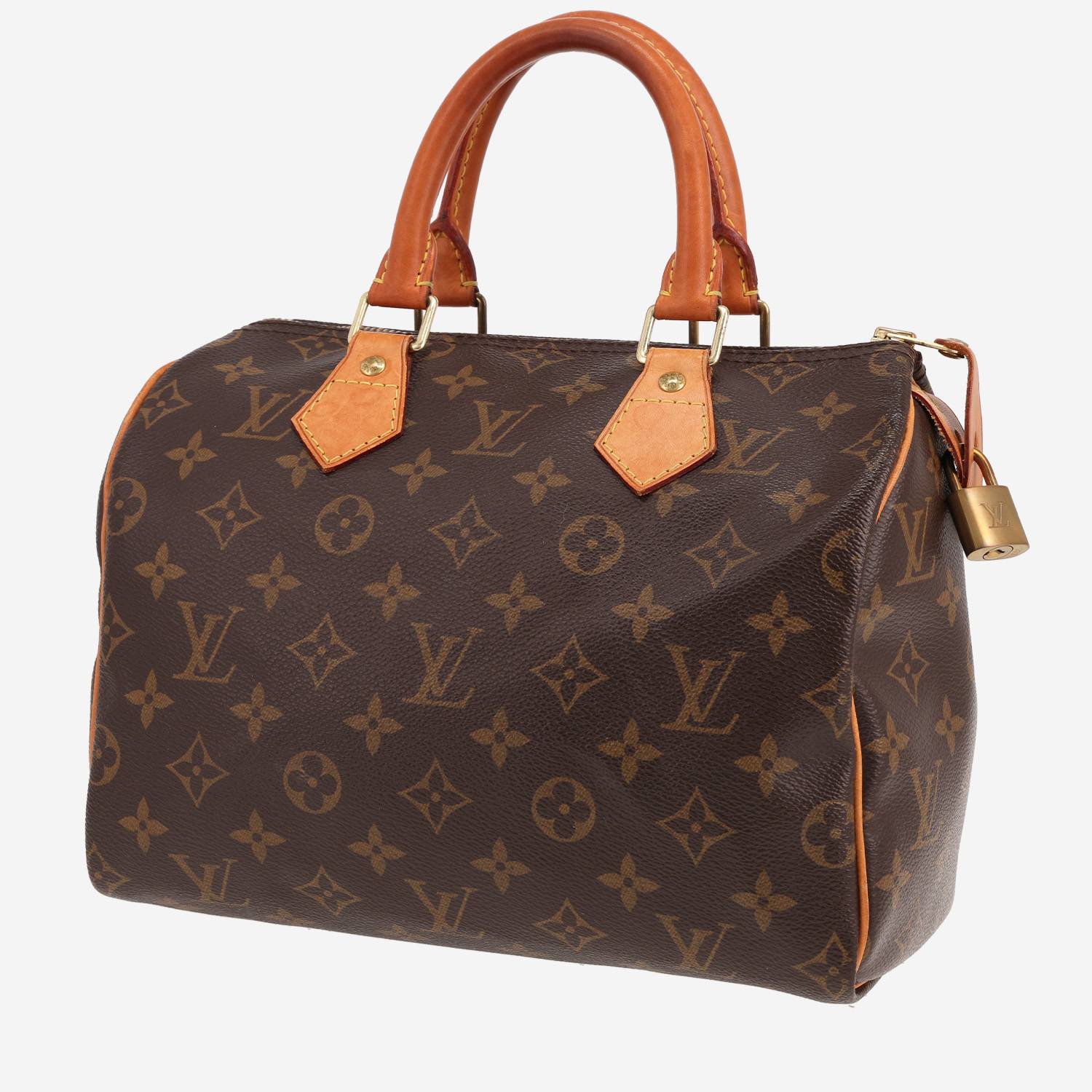 Indémodable sac à main Louis Vuitton Speedy 25 en toile monogram marron et cuir naturel, garniture en métal doré, double poignée en cuir naturel permettant un porté main.