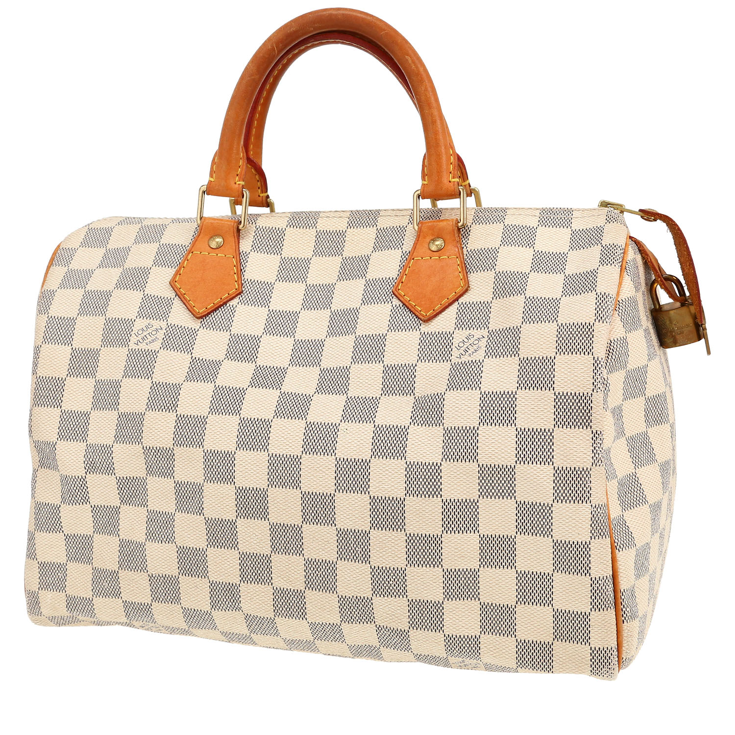 Charmant sac à main Louis Vuitton Speedy 30 en toile damier azur et cuir naturel, garniture en métal doré, double poignée en cuir naturel permettant un porté main.