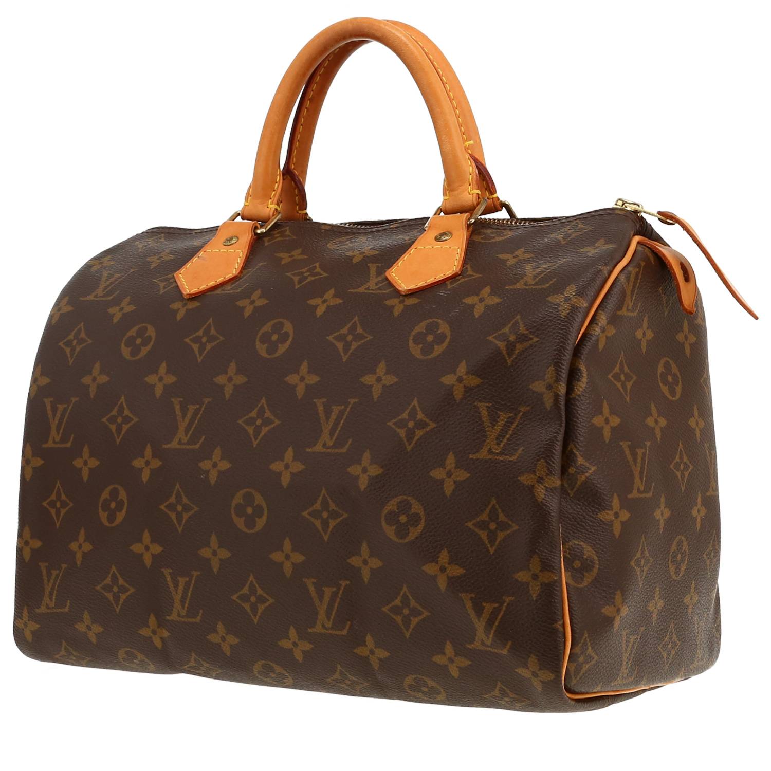 Charmant sac à main Louis Vuitton Speedy 30 en toile monogram marron et cuir naturel, garniture en métal doré, double poignée en cuir naturel permettant un porté main.