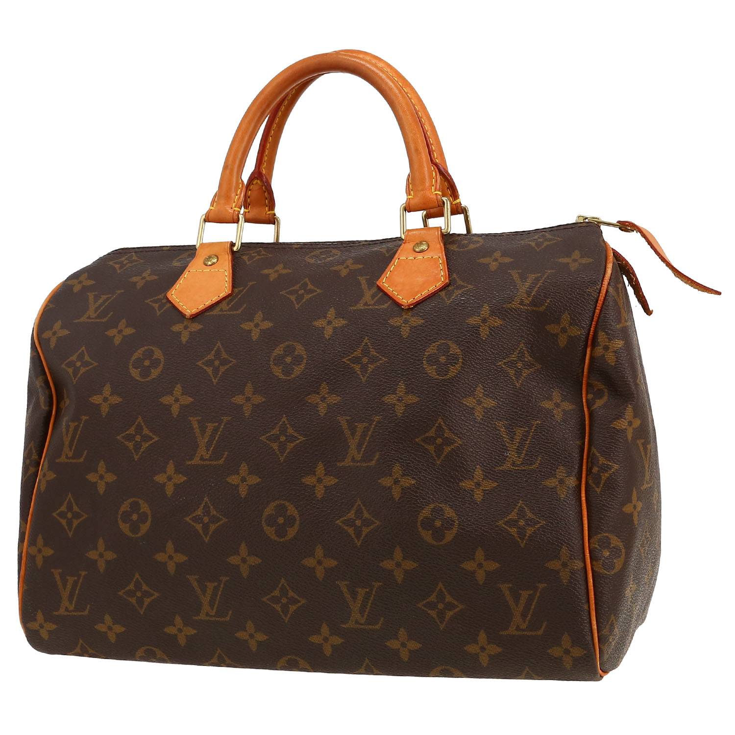 Indémodable sac à main Louis Vuitton Speedy 30 en toile monogram marron et cuir naturel, garniture en métal doré, double poignée en cuir naturel permettant un porté main.
