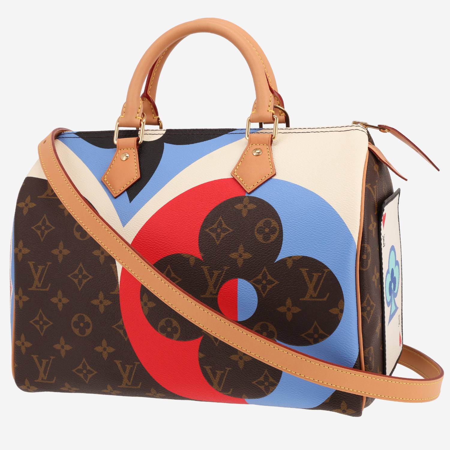 Ravissant sac bandoulière Louis Vuitton Speedy 30 en toile monogram marron à motif et cuir naturel, garniture en métal doré, double poignée en cuir naturel, une anse bandoulière amovible réglable en cuir naturel permettant un porté main ou épaule ou bandoulière.