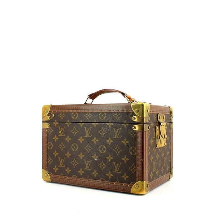Célèbre malle "Vanity" petit modèle en toile monogram marron et cuir naturel, garniture en métal doré, poignée en cuir naturel permettant un porté main.