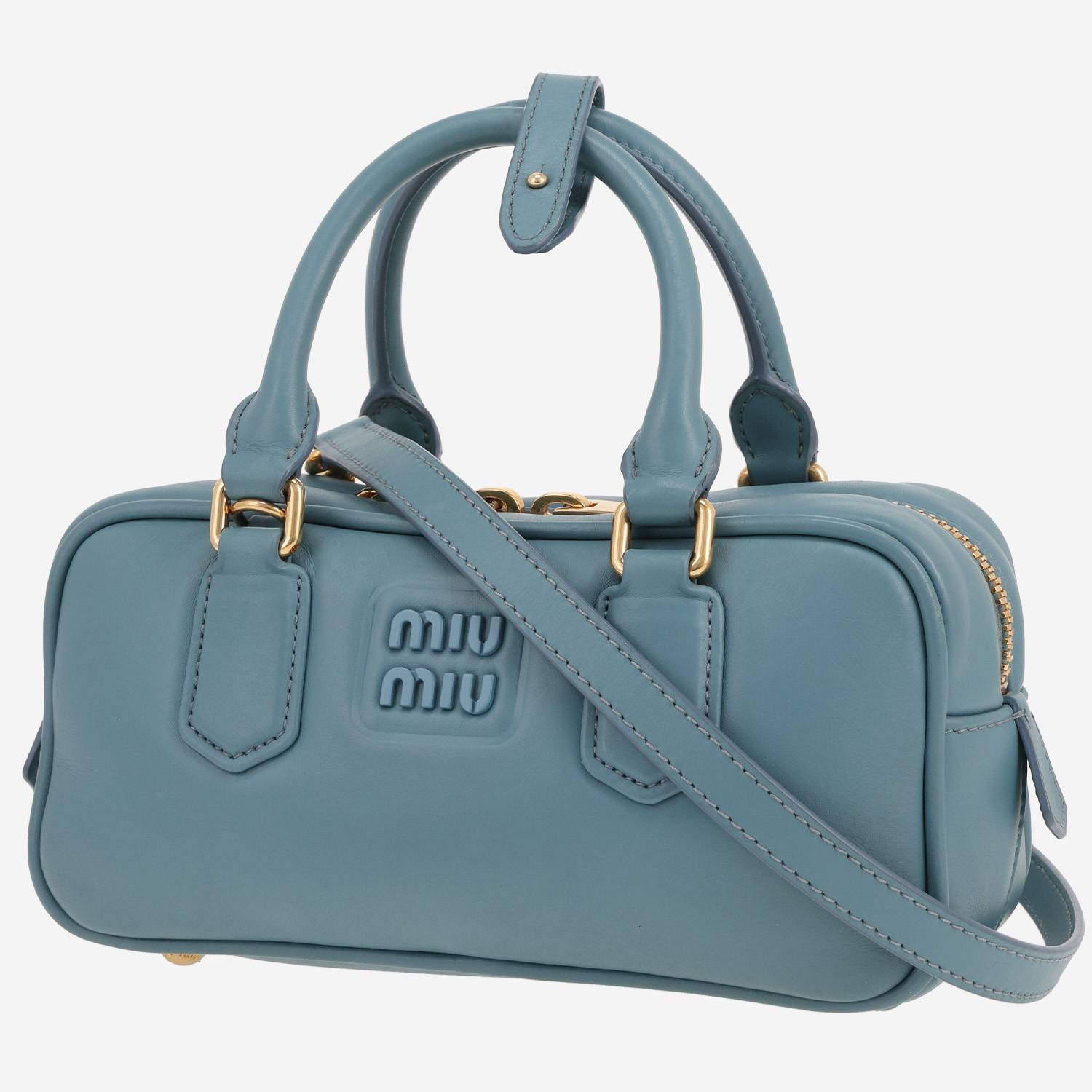 Magnifique sac bandoulière Miu Miu Arcadie en cuir bleu, garniture en métal doré, double poignée en cuir bleu, une anse bandoulière ajustable en cuir bleu permettant un porté main ou épaule ou bandoulière.