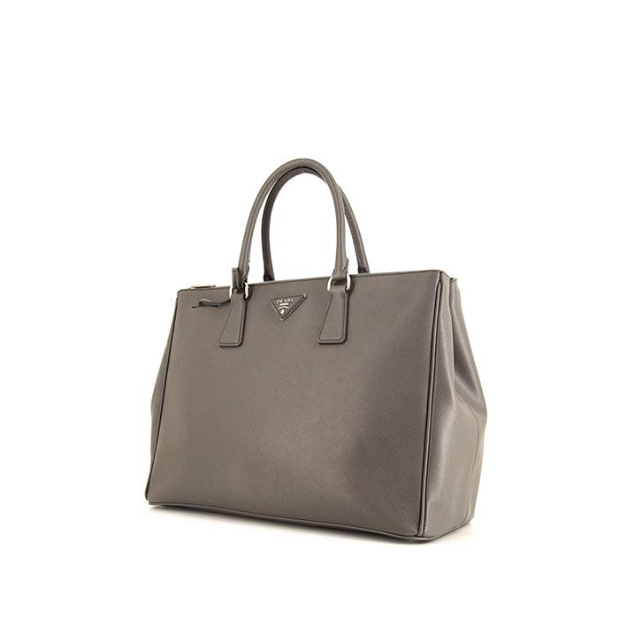 Élégant sac à main Prada Galleria grand modèle en cuir saffiano gris, garniture en métal argenté, double poignée en cuir saffiano gris permettant un porté main.