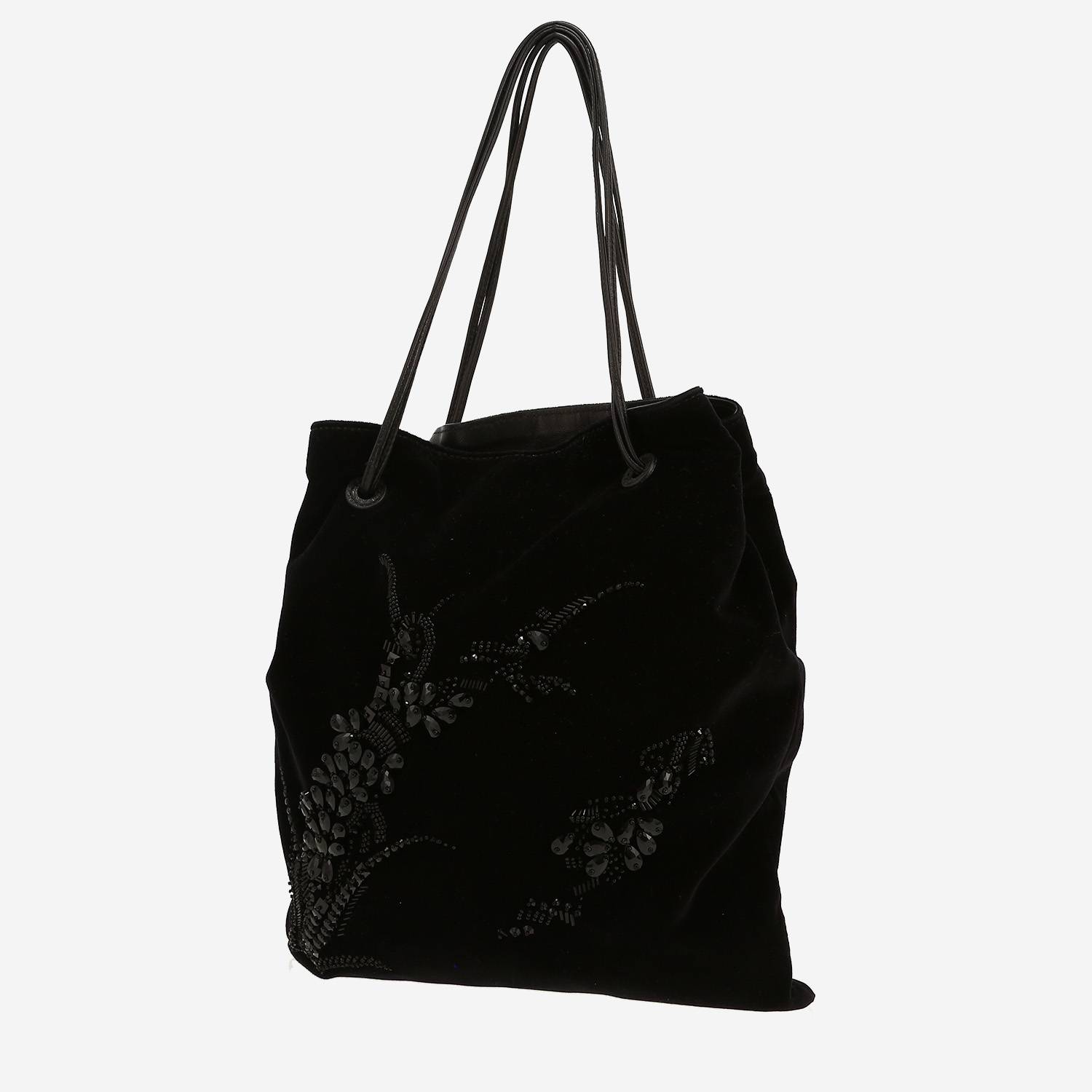 Pratique sac à main Prada en velours noir brodé de perles, double anses en cuir noir permettant un porté main ou épaule.