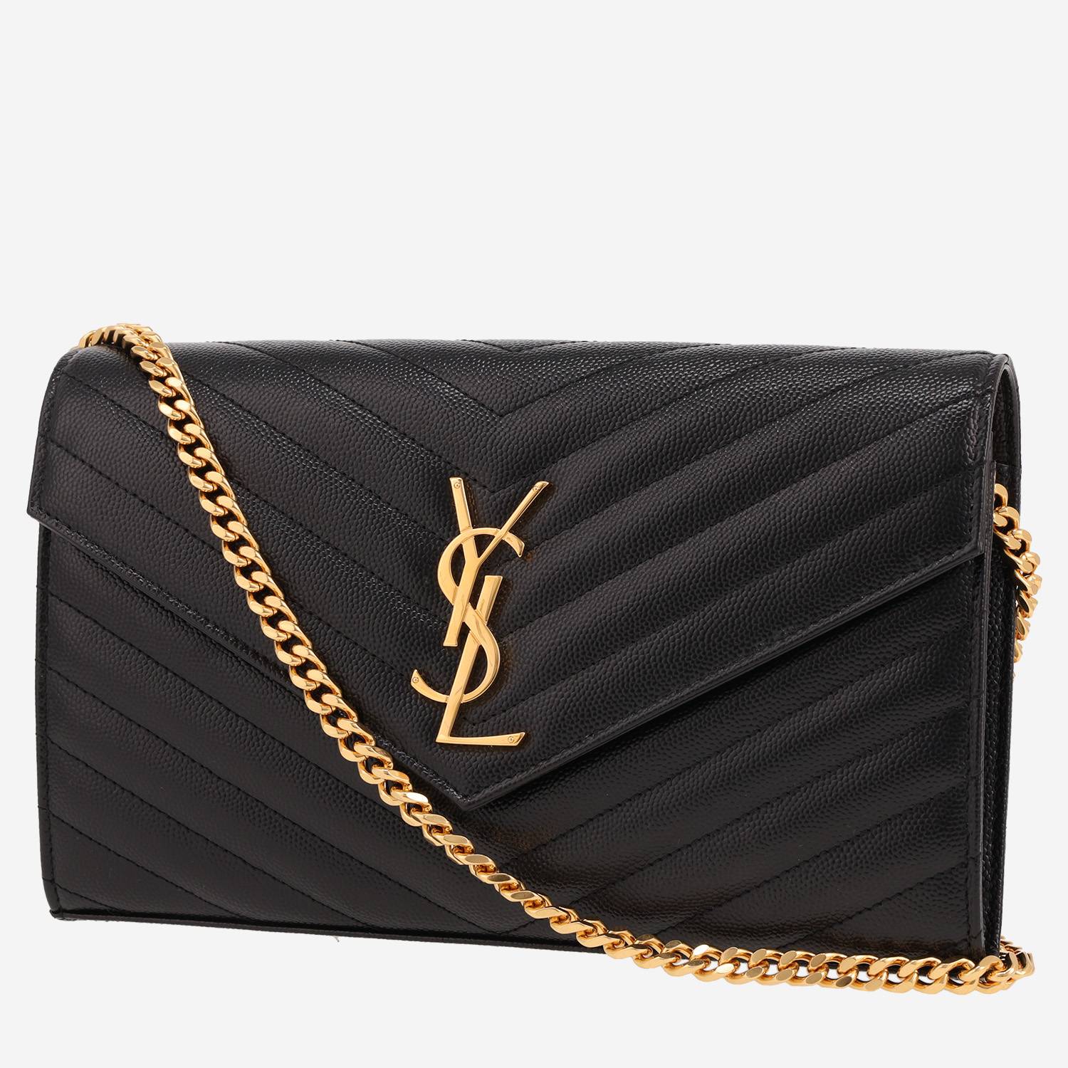 Magnifique sac bandoulière Saint Laurent Cassandre en cuir grainé noir à motifs de chevrons, garniture en métal doré, une anse-chaine en métal doré permettant un porté main ou épaule ou bandoulière.