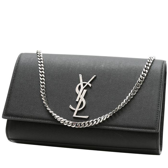 Élégant sac bandoulière Saint Laurent Kate moyen modèle en cuir grainé noir, garniture en métal argenté, une anse-chaine transformable en métal argenté permettant un porté main ou épaule ou bandoulière.
