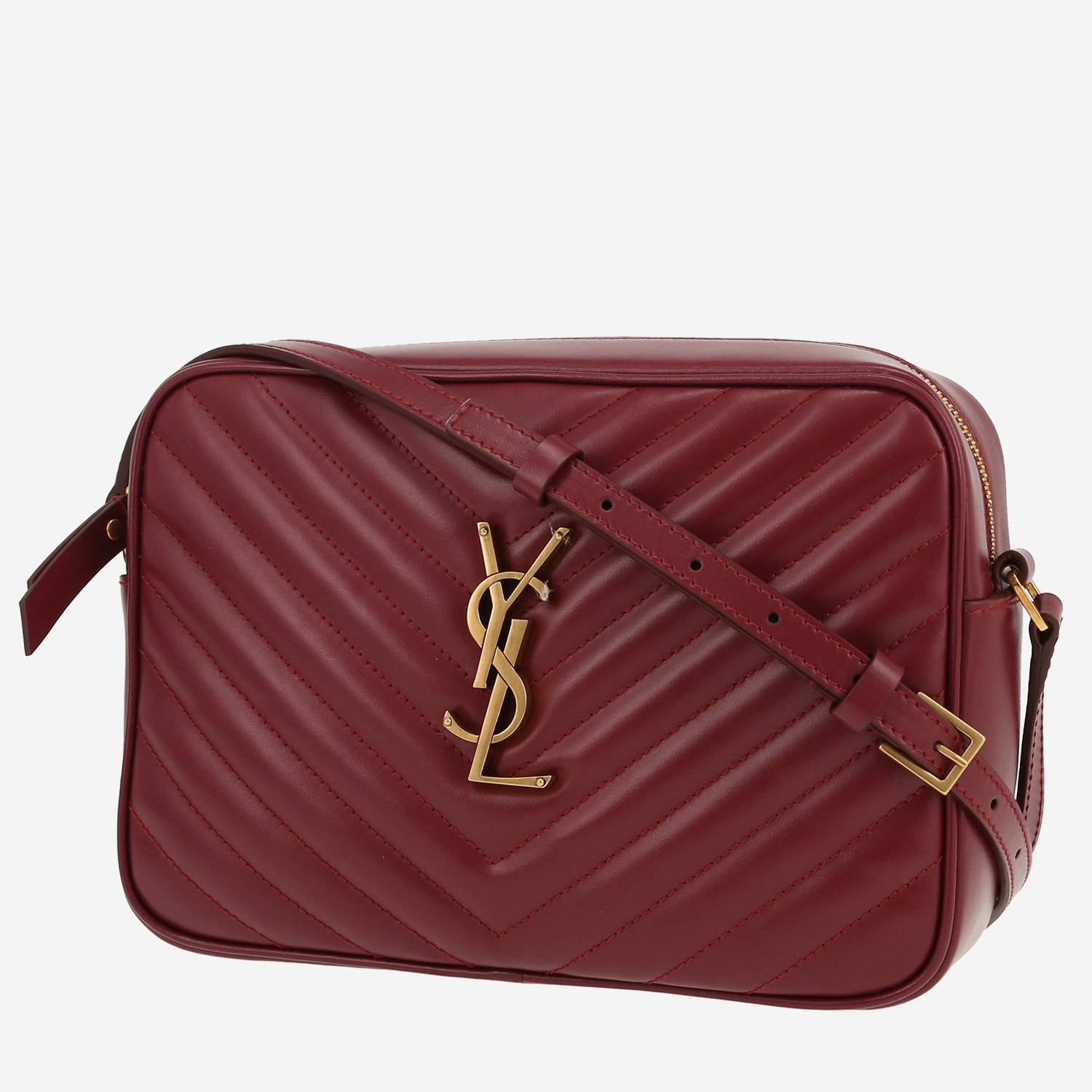 Magnifique sac bandoulière Saint Laurent Lou Sac Caméra en cuir matelassé chevrons bordeaux, garniture en métal doré, anse bandoulière ajustable en cuir bordeaux permettant un porté épaule ou bandoulière.
