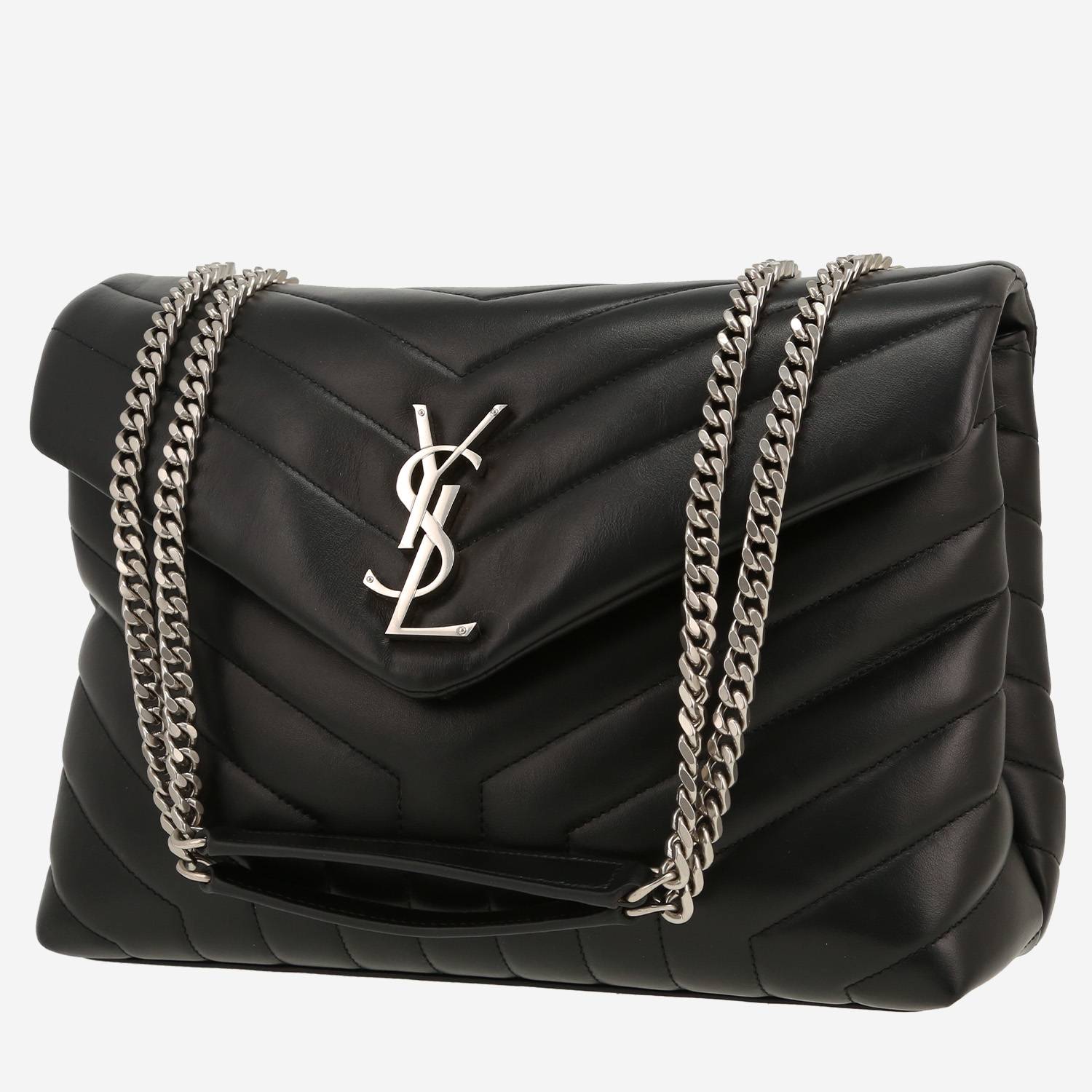 Élégant sac bandoulière Saint Laurent Loulou moyen modèle en cuir matelassé chevrons noir, garniture en métal argenté, une anse-chaine transformable en métal argenté permettant un porté épaule ou bandoulière.