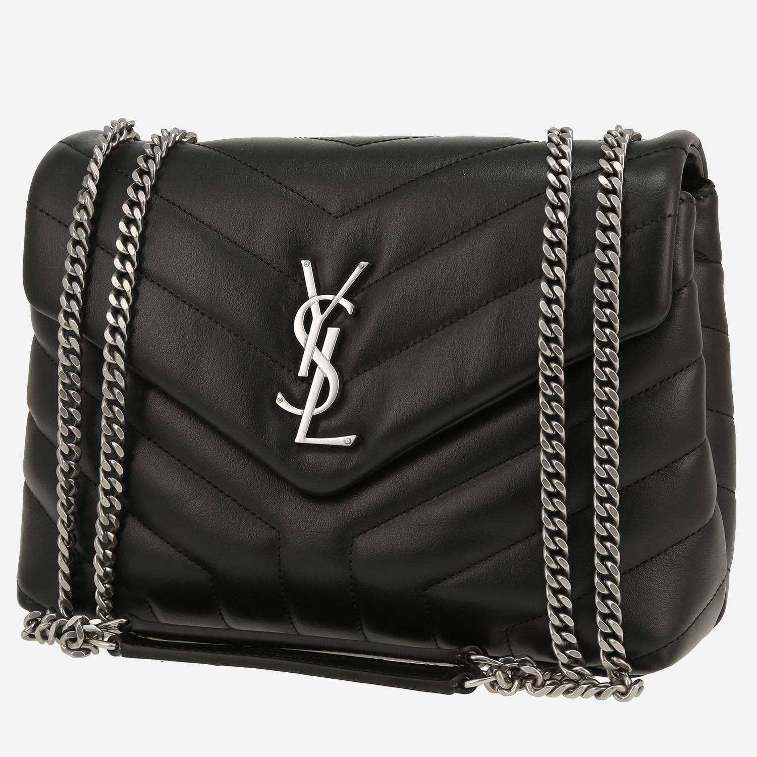 Magnifique sac bandoulière Saint Laurent Loulou petit modèle en cuir matelassé chevrons noir, garniture en métal argenté, double anse-chaine transformable en métal argenté permettant un porté épaule ou bandoulière.