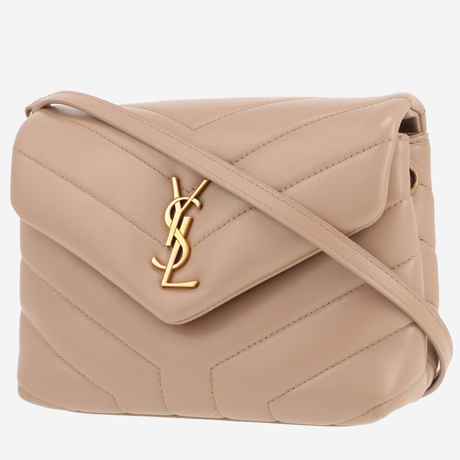 Pratique sac bandoulière Saint Laurent Toy Loulou en cuir matelassé chevrons beige, garniture en métal doré, une anse amovible en cuir beige permettant un porté épaule ou bandoulière.
