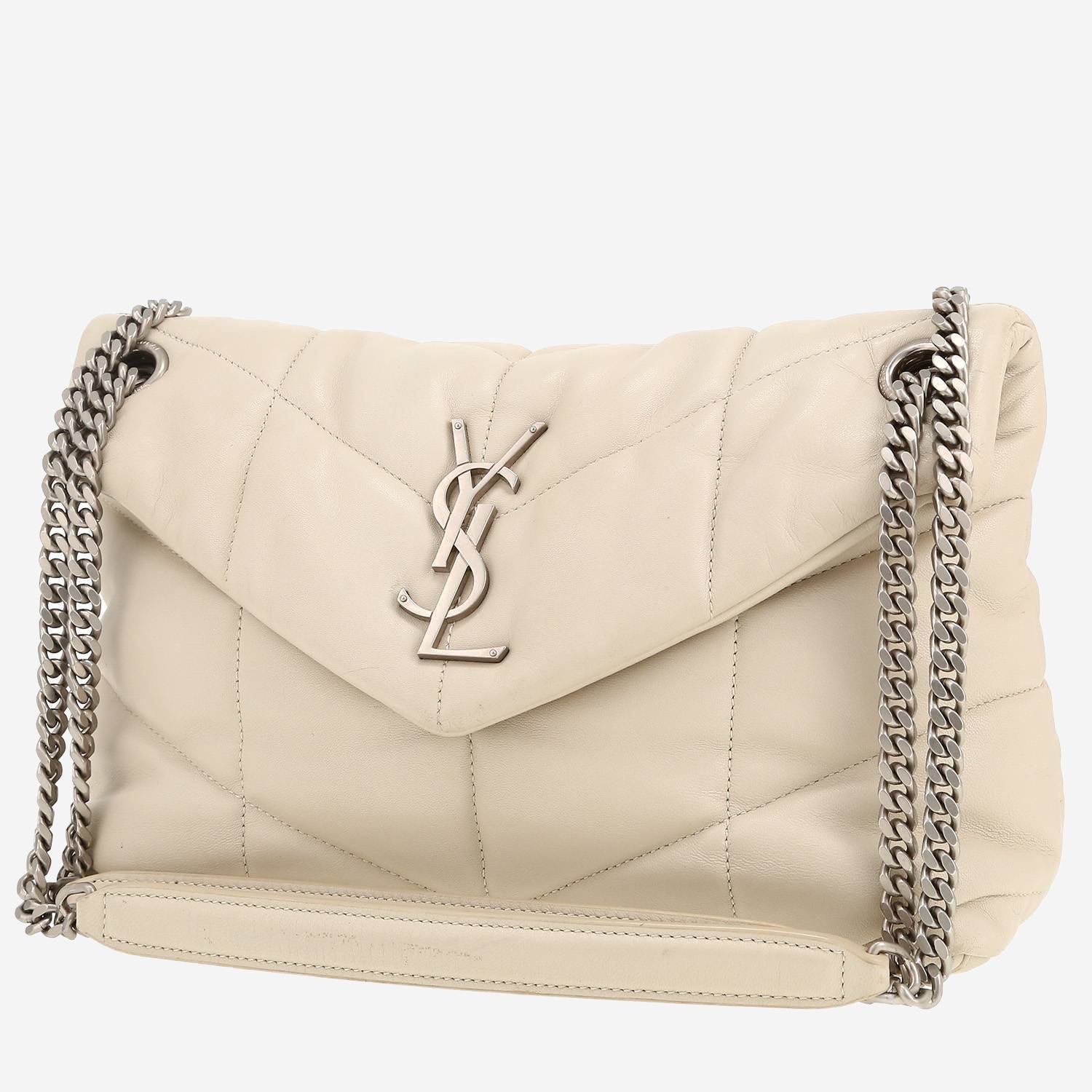 Incontournable sac bandoulière Saint Laurent Puffer petit modèle en cuir matelassé chevrons blanc-cassé, garniture en métal argenté, une anse-chaine transformable en métal argenté permettant un porté main ou épaule ou bandoulière.
