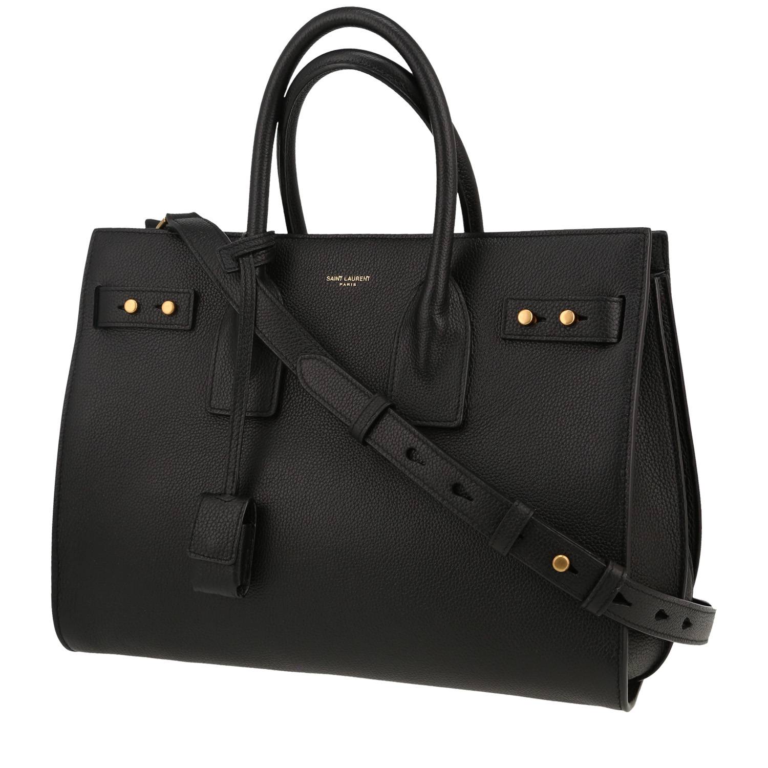 Indémodable sac à main Saint Laurent Sac de jour en cuir noir, garniture en métal doré, double poignée en cuir noir, une anse bandoulière en cuir noir.